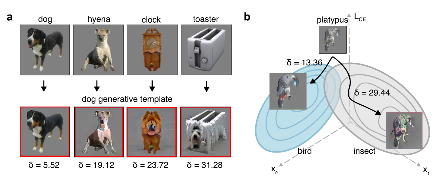 When searching for an object, you hold a target template in mind. We show this template may not be fixed prototype but is generated flexibly based on the visual input and the cost of this generation determines search efficiency. e.g., platypus is easily transformed into a bird but not into an insect (b, right).